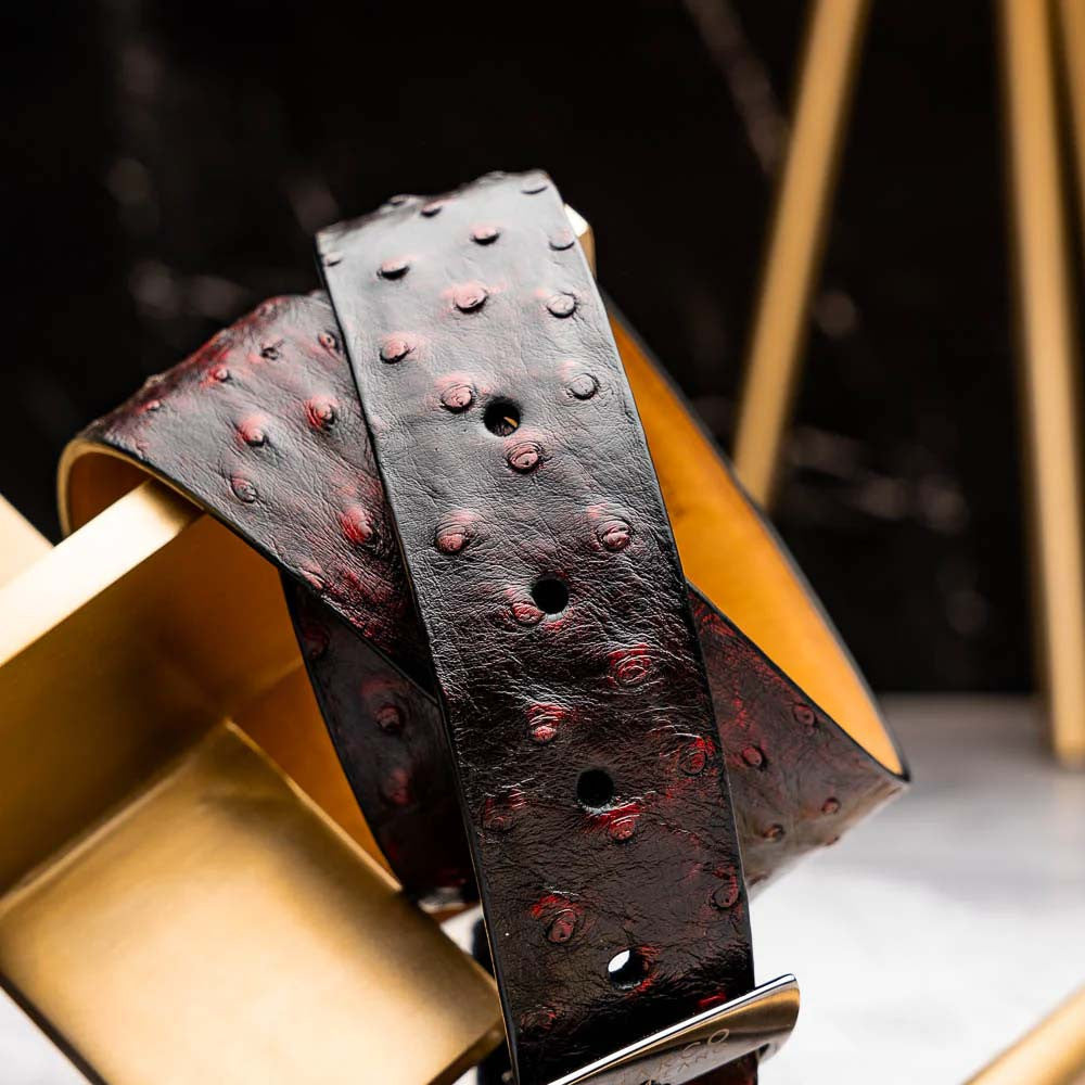 Bring sophistication and edge to your ensemble with the cherry ostrich belt. Pair it with tailored grey or charcoal trousers, or let it pop against a crisp white shirt and navy blazer. Match it with exotic shoes in darker tones for a cohesive luxury look. Whether you're stepping into a boardroom or a formal event, this belt complements any wardrobe that features bold lizard shoes, premium exotic shoes, or handcrafted alligator dress shoes from Marco Di Milano.