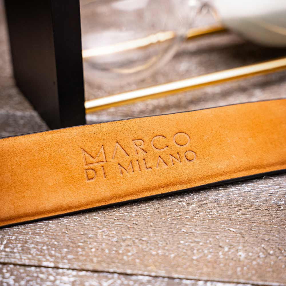 Refine your look with the Marco Di Milano black caiman fuscus-back belt, a timeless expression of luxury. Made from genuine exotic caiman with a bold, hand-polished black finish, it's perfect for pairing with alligator dress shoes or lizard shoes. The brushed chrome buckle is engraved with the Marco Di Milano signature and can be removed for easy adjustment. Whether you're dressing up in exotic shoes or elevating your everyday wear, this belt blends artisan detail with upscale versatility.
