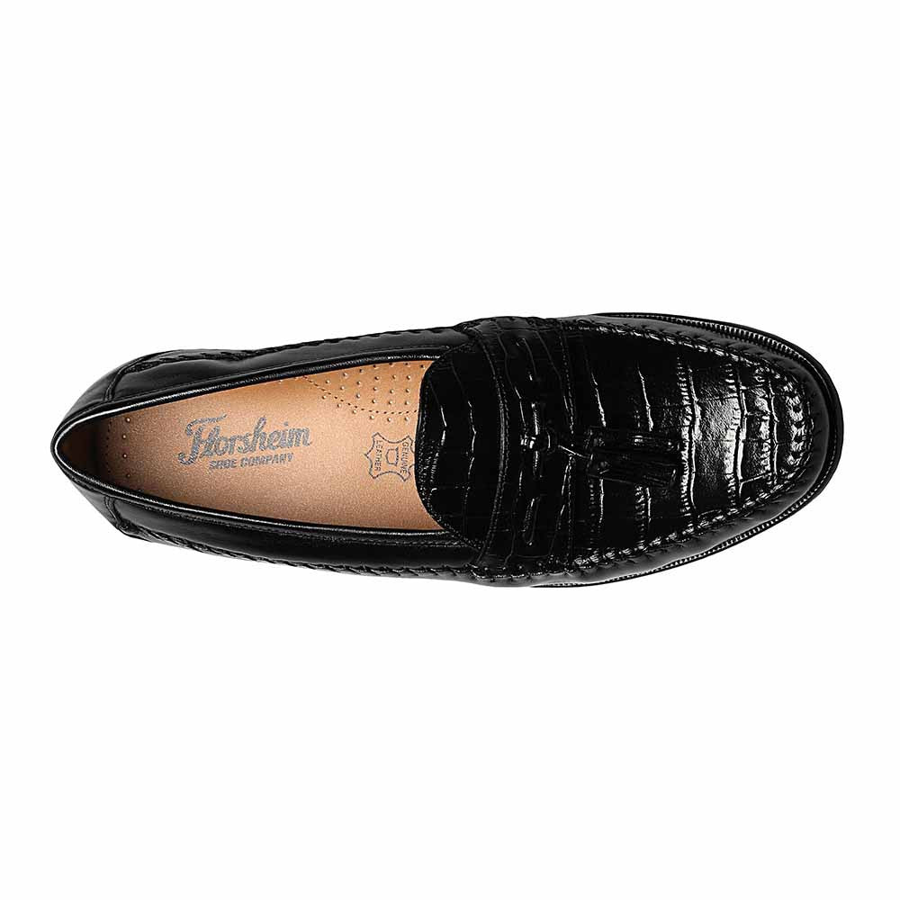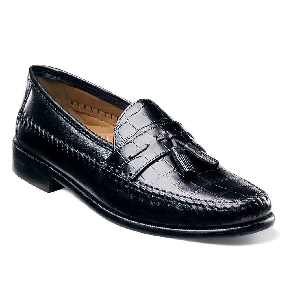 Elevate your footwear collection with the Florsheim Pisa Black Moc Toe Tassel Loafer, a timeless classic that exudes sophistication and style. Crafted with genuine handsewn construction, this loafer showcases impeccable craftsmanship and attention to detail, ensuring lasting quality and comfort. The unique whip-stitch detail adds a touch of character and refinement to your ensemble, making the Pisa Loafer a standout choice for any occasion. Designed for versatility, this shoe effortlessly transitions from formal suits to casual jeans, making it a go-to option for all your dress and casual occasions. The luxurious combination of nappa leather and crocodile print leather upper exudes luxury and sophistication, while leather linings enhance breathability, keeping your feet cool and comfortable throughout the day. The fully cushioned footbed provides plush support and cushioning for all-day wear, while the durable non-leather sole offers stability and traction with every step. Whether paired with tailored trousers for the office or jeans for a casual outing, the Florsheim Pisa Moc Toe Tassel Loafer is sure to elevate your style with its timeless design and exceptional comfort.