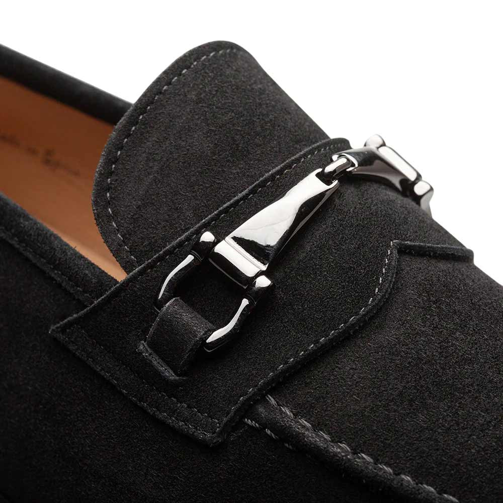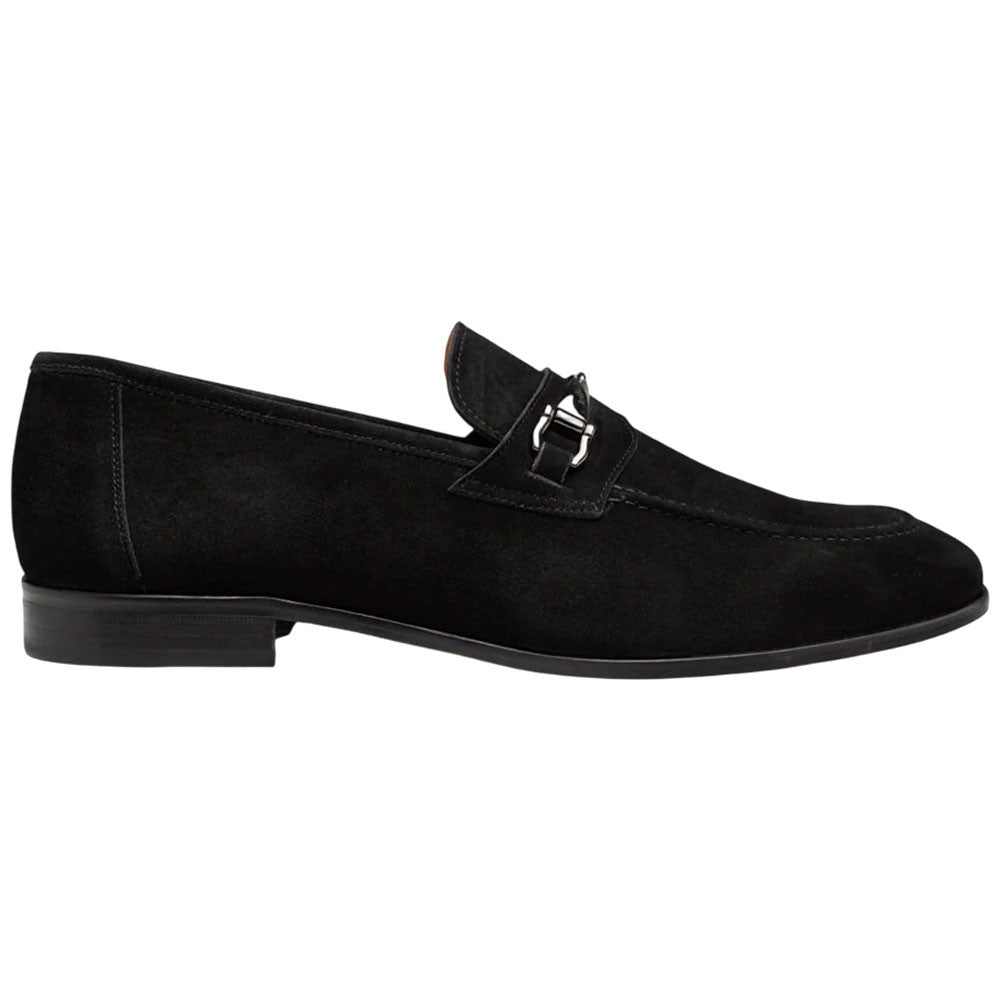 Pair the black suede loafer with a tailored charcoal suit for a sleek business look, or with slim black jeans and a crisp white shirt for an elevated casual ensemble. The burnished finish and ornament detail add richness and refinement, ensuring the shoe stands out in understated ways. Perfect for versatile wear, these Mezlan dress shoes transition easily from professional settings to evening events, making them a wardrobe essential for men who value timeless, modern elegance.