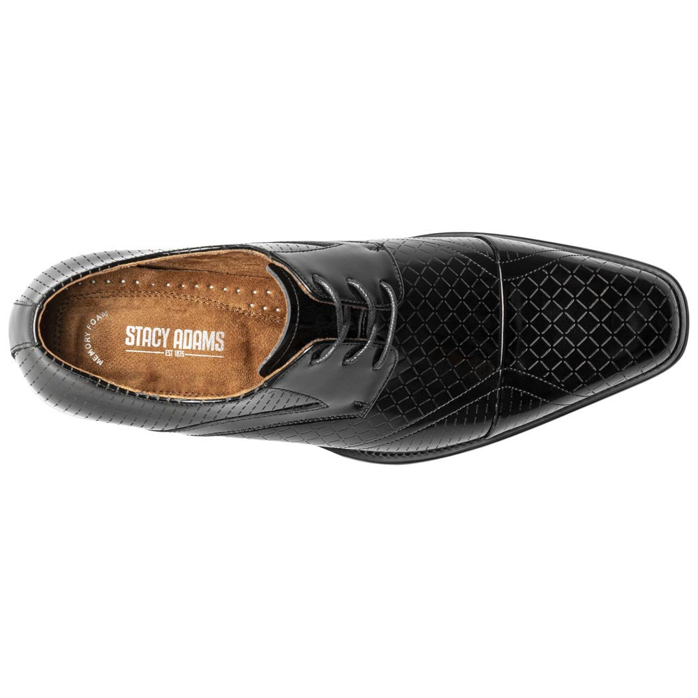 The Stacy Adams Hobson Oxford brings a bold, architectural edge to classic dress footwear. Wrapped in high-shine black patent leather, the shoe features a striking embossed grid design that adds depth and movement to every step. The streamlined oxford profile keeps things sharp and refined, while the cushioned interior ensures comfort from the first wear. It's a statement piece that still respects tradition, balancing innovation with the timeless polish Stacy Adams is known for.