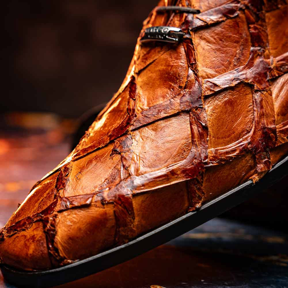 Pair the Olivieri Cognac with navy suits, charcoal trousers, or cream chinos for a vivid contrast that commands attention. This warm-toned pirarucu Oxford offers the same class as alligator dress shoes but with a rare, eye-catching scale pattern. Lizard shoes may offer sleekness, but Olivieri's natural texture makes every step memorable. Whether for weddings or upscale dinners, Marco Do Milano's exotic cognac shoes bring flair, refinement, and originality to your footwear game.