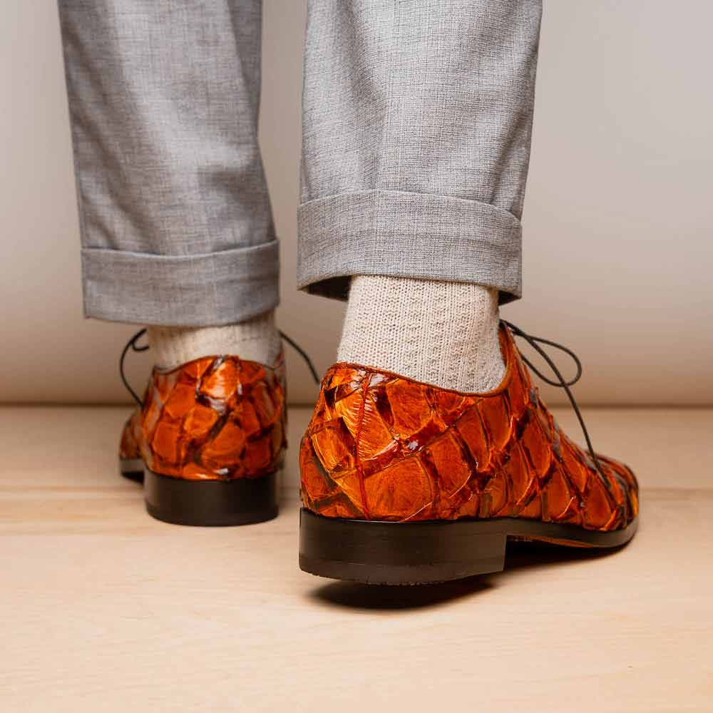 The Olivieri Brandy Oxford effortlessly enhances semi-formal to upscale looks. Pair these exotic shoes with navy or cream trousers and a crisp shirt for a modern ensemble. Their rich alligator dress shoes, energy, and pirarucu texture add refined flair to jeans, chinos, or slacks alike. These lizard shoes alternatives bring tropical exoticism and polished appeal to events, dinners, and business occasions. With Marco Do Milano, style isn't just worn, it's defined with confidence and bold luxury.