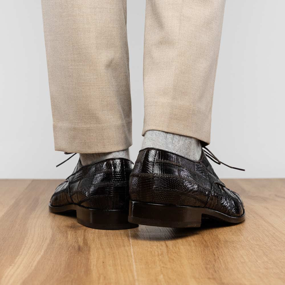 Pair the Pissa brown patchwork derby with tailored navy trousers, earth-toned blazers, or dark denim for a look that radiates refined individuality. These alligator dress shoes bring bold texture and richness to any outfit, while the square toe keeps things structured and sharp. Whether for business events, formal dinners, or upscale casual weekends, these exotic shoes are designed to turn heads. From lizard shoes to crocodile styles, Marco Do Milano ensures every step speaks volumes about your taste.