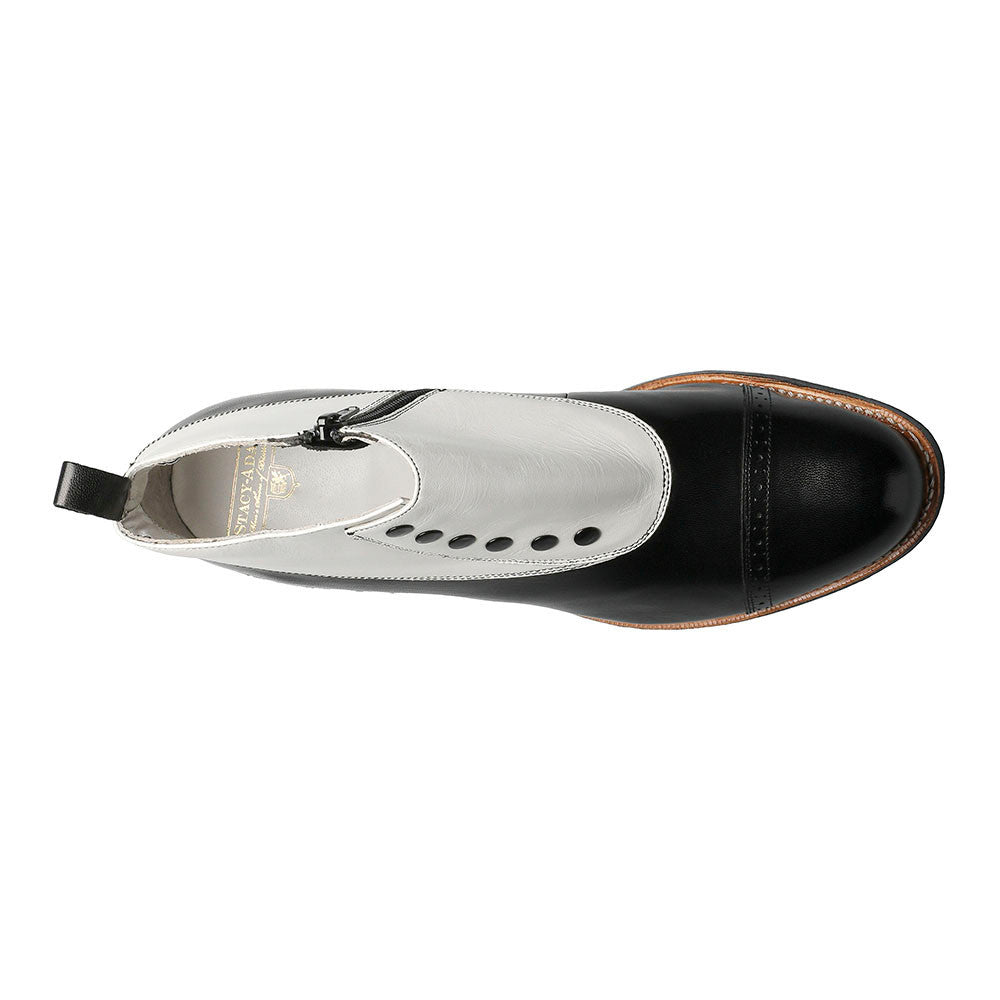 * Two-tone design with a decorative buttoned spat and side zipper.