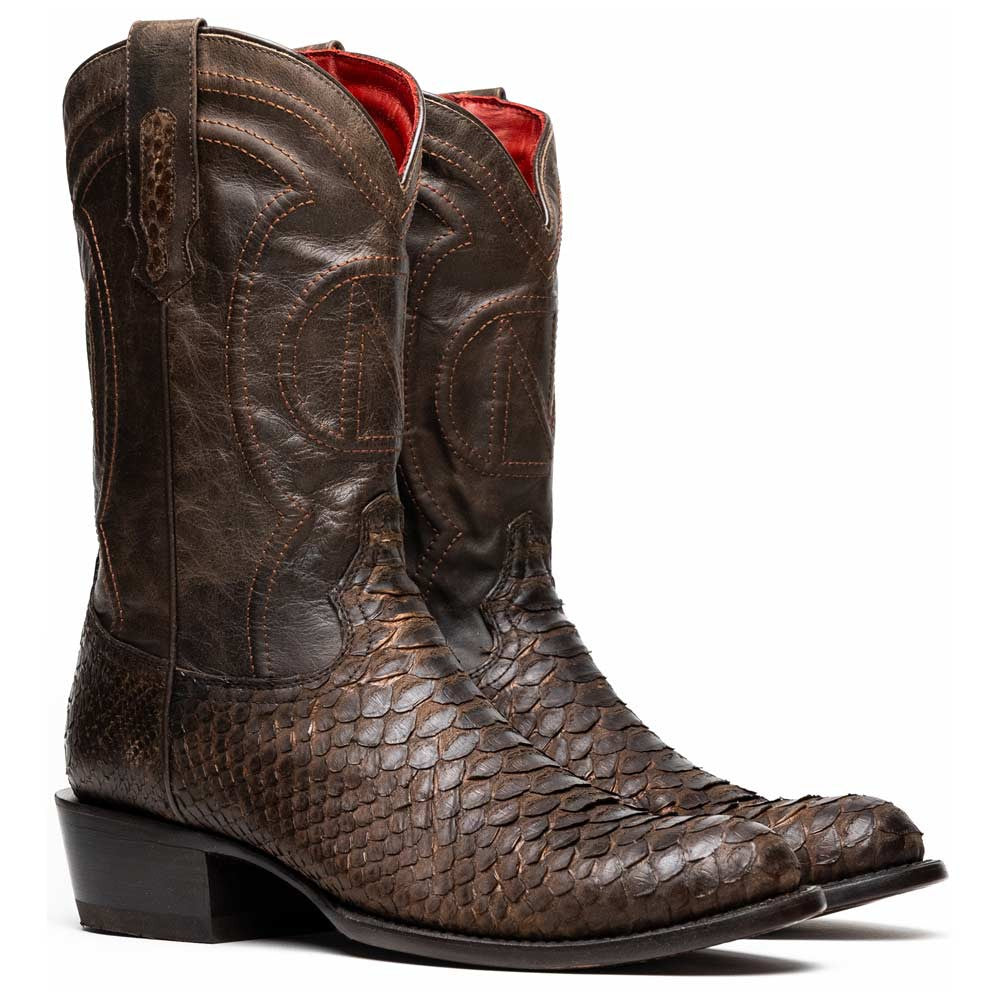 The KANSAS Brown Cowboy Boot blends authentic Western heritage with exotic luxury. Crafted from genuine brown python skin, the vamp reveals natural scale patterns in warm, earthy tones, complemented by a full-grain leather shaft with contrast stitching. The round toe design nods to cowboy tradition, while the signature red leather lining adds a refined touch. Finished with a hybrid leather and TPU sole for lasting comfort, the KANSAS Brown offers rugged charm and elevated style, perfect for men who appreciate handcrafted detail.